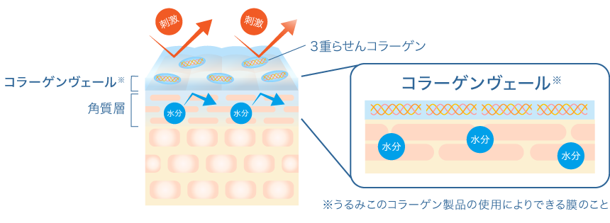 3重らせんコラーゲンの膜が、肌表面にとどまり、長時間の水分保持力で高保湿を保ちます。 また、外部刺激から肌を守り、肌内部からの水分蒸発を抑え、肌本来のバリア機能をサポートします。