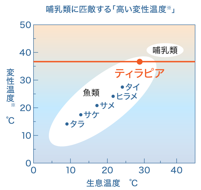 コラーゲンの変性温度は、魚の場合、生息温度に依存します。 私たちは、3重らせん構造がほどけにくいよう熱帯魚ティラピアを原料にしています。 そのため、哺乳類のコラーゲンに匹敵する変性温度になっています。