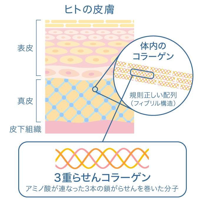 生体内では、コラーゲンは「3重らせん構造」をとっています。 この3重らせん構造を壊さないために非加熱で丁寧に取り出し、独自の高度な精製技術により得られた高純度コラーゲンを使用しています。