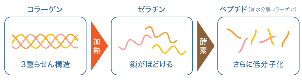 コラーゲンは加熱すると変性し、元には戻りません。 変性すると3重らせん構造ならではの優れた保水機能などが失われてしまいます。 私たちは非加熱で抽出することにより、生体内の3重らせん構造を保ったままの生コラーゲンを製品化しました。