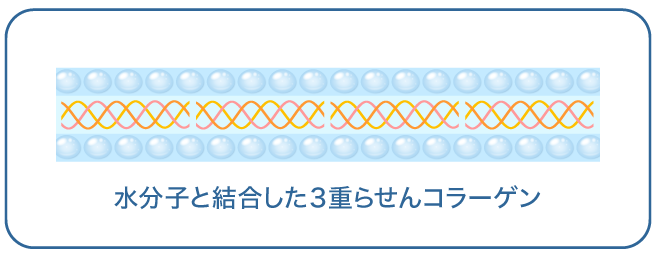 3重らせんコラーゲンの膜が、肌表面にとどまり、長時間の水分保持力で高保湿を保ちます。 また、外部刺激から肌を守り、肌内部からの水分蒸発を抑え、肌本来のバリア機能をサポートします。
